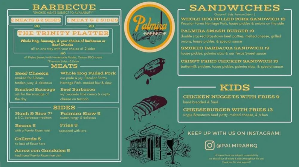 Introducing Palmira Barbecue, a Puerto Rican barbecue joint located at 2366 Ashley River Rd Bldg 1 Charleston, SC 29414. This restaurant offers a unique fusion of Puerto Rican flavors and traditional barbecue dishes. Their menu showcases a variety of mouthwatering dishes that are sure to satisfy your taste buds. From juicy ribs to flavorful chicken, Palmira Barbecue has something for everyone.
